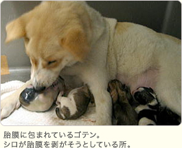 その後すぐに胎膜に包まれた体全体が出てきたが胎盤がまだ中に残っており、シロが臍帯を引っ張って胎盤を引きずり出した。胎盤、胎膜等を食べながら上手く剥がしっていった。
