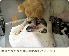 もし、母犬が胎膜に包まれた胎児を産み落としただけで何もしない場合は、飼い主が変わりに胎膜を破り、臍帯を体から1cm位の位置で糸で結び、その先をハサミできり、乾いたタオルで良く体を拭いてあげなければならない。