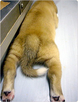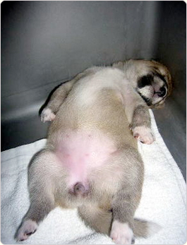 この時期は、まだ自分の意思で排尿・排便をしないので、写真のように外陰部や肛門にティッシュペーパーやタオルをあてがいマッサージすることにより、刺激を加えることで子犬に排尿・排便をさせている。