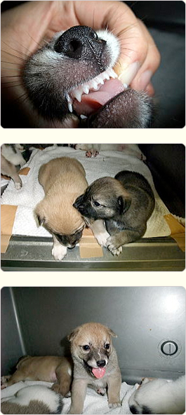 一番上の写真はミニーの口です。だいぶん乳歯がしっかりと生えてきました。通常、生後3週間前後から乳歯が生え始めます。この頃になると母乳を吸う口唇反射が消え、乳首を噛んだりするようになるので、母犬は痛いために授乳を嫌がるようになります。しかし、シロは今のところ子育てに少し疲れている感じはありますが、嫌がる様子もなく母乳をあげ続けています。また、仔犬達は今はみんな哺乳瓶からではなく、お皿からミルクを飲めるようになっています。なので、そろそろ、ミルクから離乳食に切り替えようと思っているところです。